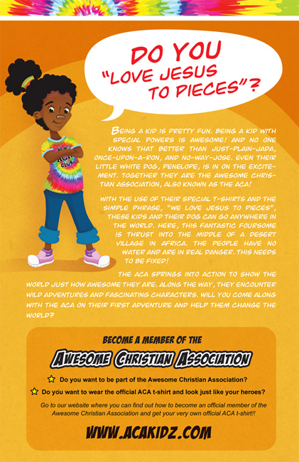 Artist Representation: Tugeau 2 Agent: Nicole Tugeau p - (216) 707.0854 e - nicole@tugeau2.com w- tugeau2.com Contact Information: Merrill Rainey p - +1 (440) 315.0598 e - merrillr@littlerainey.com Being a kid is pretty fun. Being a kid with special powers is AWESOME! And no one knows that better than Just-Plain-Jada, Once-Upon-A-Ron, and No-Way-Jose. Even their little white dog, Penelope, is in on the excitement. Together they are the Awesome Christian Association, also known as The ACA! With the use of their special t-shirts and the simple phrase, “We love Jesus to pieces”, these kids and their dog can go anywhere in the world. Will you come along with the ACA on their first adventure and help them change the world? the thumbnail image to your right, enjoy!! © 2013 ACA Kidz • acakidz.com Client - Stepping Stones
